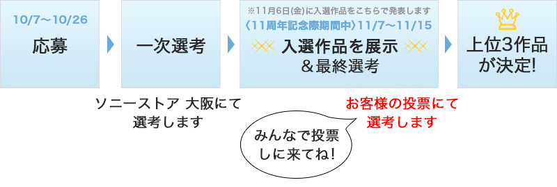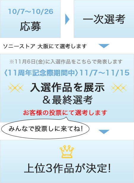 入賞した20作品を、2015年11月7日(土)〜11月15日(日)の期間、ソニーストア 大阪前の通路に展示します。