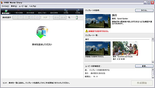 「VAIO Movie Story」は2007年9月発売のVAIOから標準搭載された動画作成アプリケーションで、本日から無償ダウンロードを開始した「VAIO Movie Story体験版」では製品版の基本操作をご提供します。