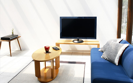 明るい部屋に大人の落ち着きを与える〈ブラビア〉 ZX1のネイビーブルーを使用した商品構成例。深い絶妙な色合いのベゼルが、違和感なく室内にとけ込みます。ワイヤレスモデルを選択することで、テレビ台を既にお持ちの方でも、インテリアの雰囲気を損なうことなく、気軽にライフスタイルに取り入れることができる組み合わせです。