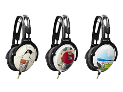 ヘッドホンコードボタンをプッシュするだけで本体に巻き取って収納できるオーバーヘッドバンド式ステレオヘッドホン『MDR-D333LW』のハウジング部にアーティスト3名の作品を用いた商品です。あしらわれたアートは左右のハウジング部で異なっており、人目を引くデザインです。