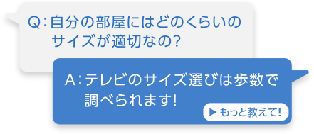 とはいえ、メジャーを持ってきてはかるのも面倒なので、歩幅でチェックしてみましょう。あくまでも目安ですが、40v型なら1歩、75v型までが2歩、3歩離れれば100v型でも大丈夫です。