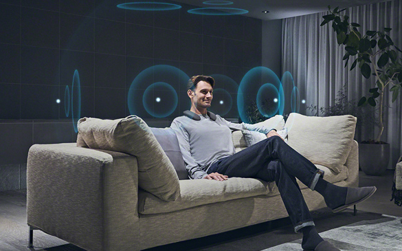 ワイヤレスネックバンドスピーカー「SRS-NS7」は、肩にのせるだけで、映像の中に入り込んだようなDolby Atmosの臨場感ある立体音響を堪能いただけます。