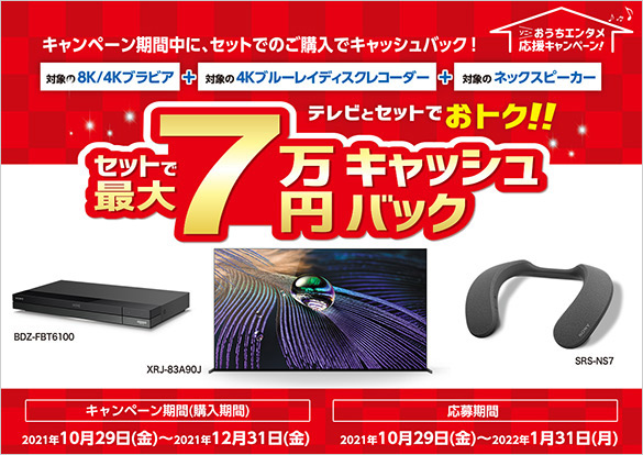 現在、ブラビアはブルーレイディスクレコーダーやネックスピーカーと同時購入で最大7万円キャッシュバックする、おうちエンタメ応援キャンペーンを実施中です。