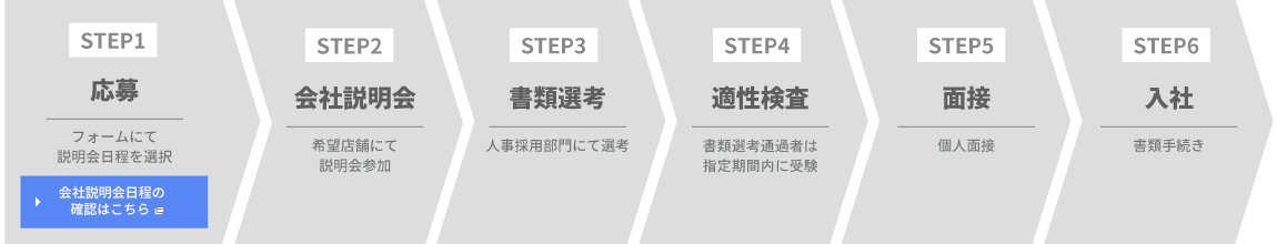※書類選考・面接においては合否に関わらず1週間を目安にご連絡さしあげます。