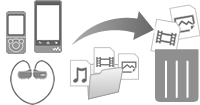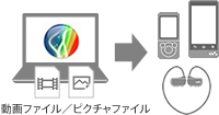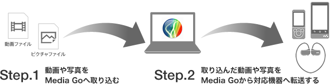 Media Goを使用して、ウォークマン®などの対応機器へ動画や写真を転送することができます。 動画や写真を対応機器へ転送するには、「動画や写真をMedia Goへ取り込む」と「取り込んだ動画や写真をMedia Goから対応機器へ転送する」の2つのステップを行なってください。