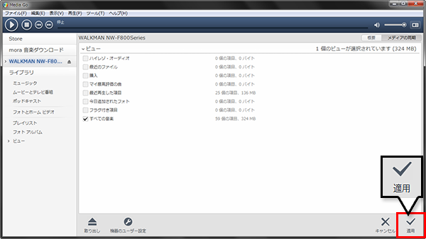 次回以降、Media Go起動中のパソコンへ機器をUSBケーブルで接続するたび、抽出条件(ビュー)に一致したコンテンツが、Media Goから機器へ自動転送(同期)されるようになります。