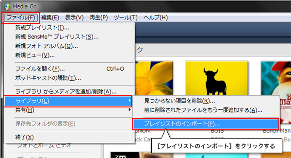 Media Goの上部メニューから[ファイル]をクリックして、[ライブラリ]-[プレイリストのインポート]を選択してください。