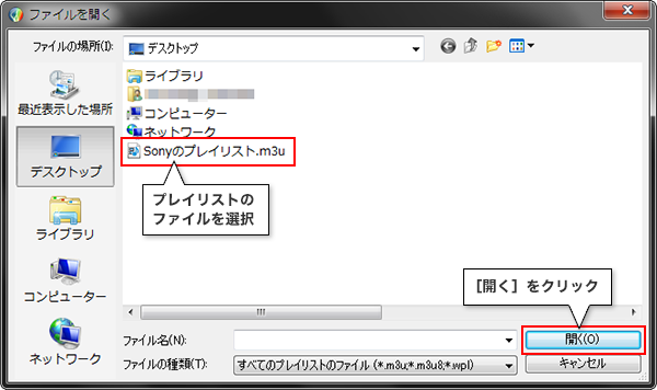 ファイル選択のウインドウが表示されるので、お持ちのプレイリストのファイルを選択してから、[開く]ボタンをクリックしてください。プレイリストが取り込みされます。
