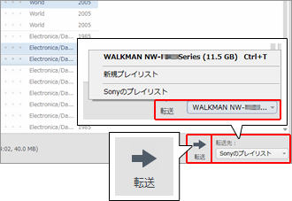 プレイリストへ追加したい楽曲を選択したら、画面右下にある「転送先」のプルダウンをクリックして、作成したプレイリストを指定してください。