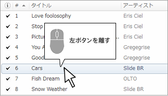 ②選択された状態(青い背景色)の楽曲をもう一度クリックして、クリックしたまま、変更したい場所まで動かす。