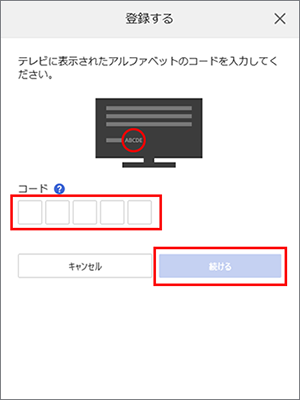 ブルーレイディスクプレーヤーの登録コード*を入力し「続ける」をクリックします。