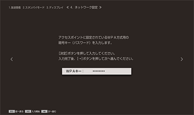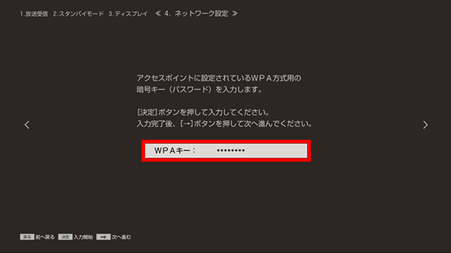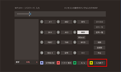 お使いの無線LANルーターの無線暗号化キー(パスワード)を入力したら、[入力終了]を選び、「決定」ボタンを押す