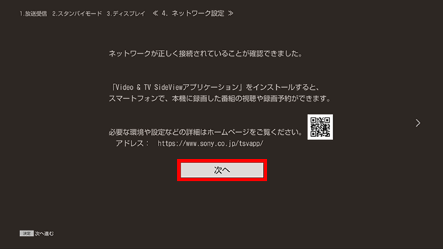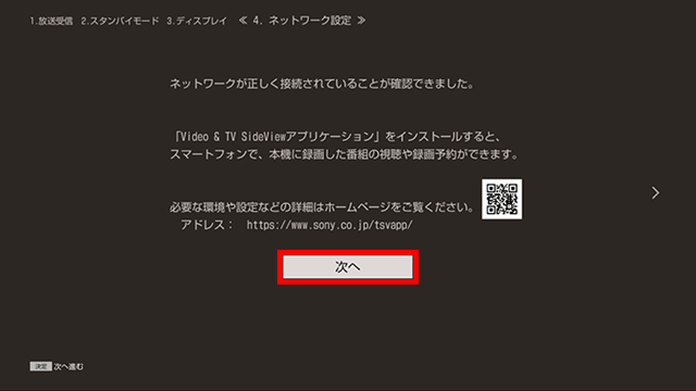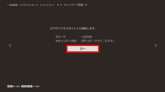無線LANルーターの情報が表示されたら、[次へ]を選択する(またはリモコン「→」ボタンを押す)