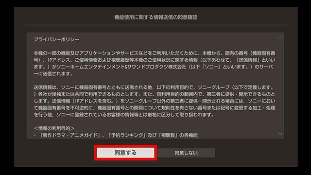 [機能使用に関する情報送信の同意確認]が表示されたら、内容を確認し、[同意する]を選択する