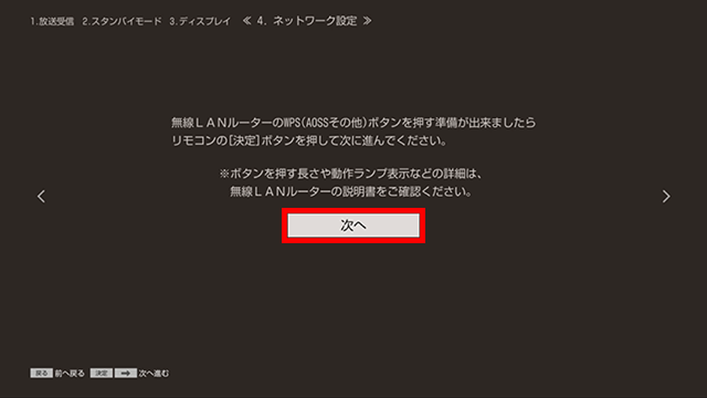 無線LANルーターのWPSボタンを押す準備ができたら、[次へ]を選択する