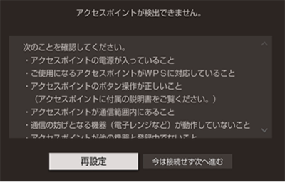 「アクセスポイントが検出できません。」などと表示され、WPSボタンを押しても設定できない(反応がない)場合は?