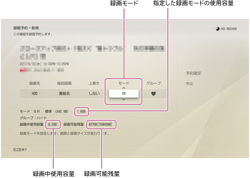 また、この画面で指定した録画モードで使用する容量と録画可能残量(空き容量と時間)を確認することができます。