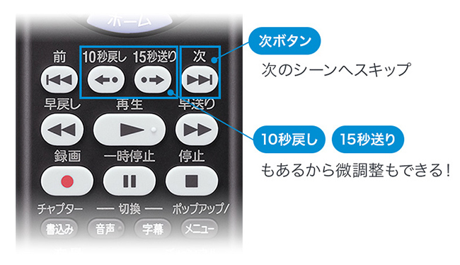 リモコンの「次」ボタンで、次のシーンへ飛んですぐに再生できます。