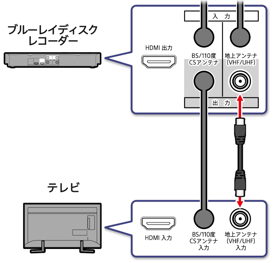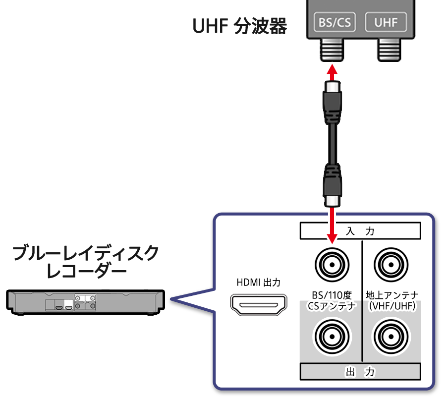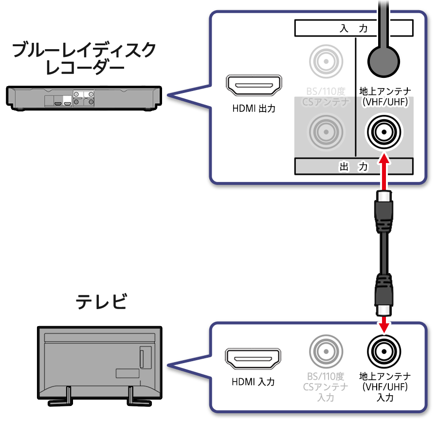 - ブルーレイディスクレコーダーの「地上アンテナ(VHF/UHF)」出力端子と、テレビの「地上アンテナ(UHF/VHF)」入力端子(*1)を、地上アンテナケーブル(別売または本機付属)でつなぎます。