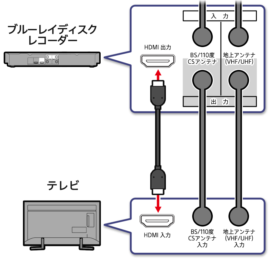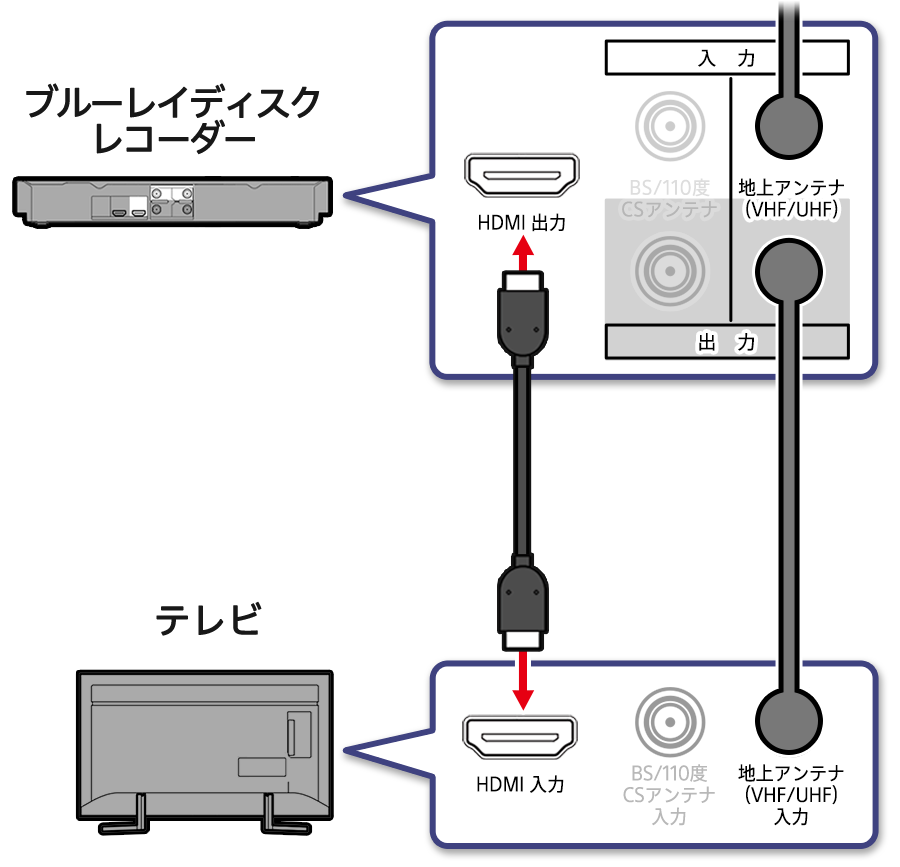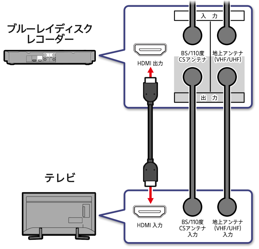 - ブルーレイディスク/DVDレコーダーの「HDMI」出力端子と、テレビの「HDMI」入力端子を、HDMIケーブル(別売り)*2 でつなぎます。