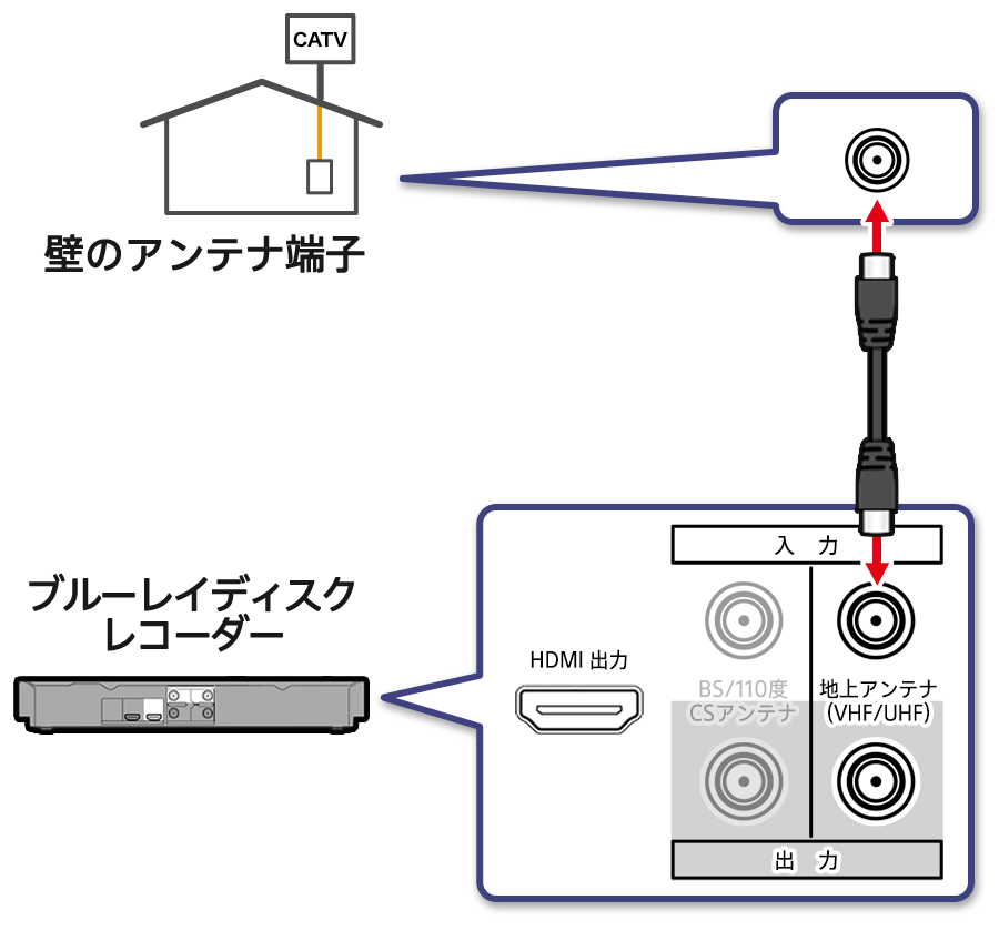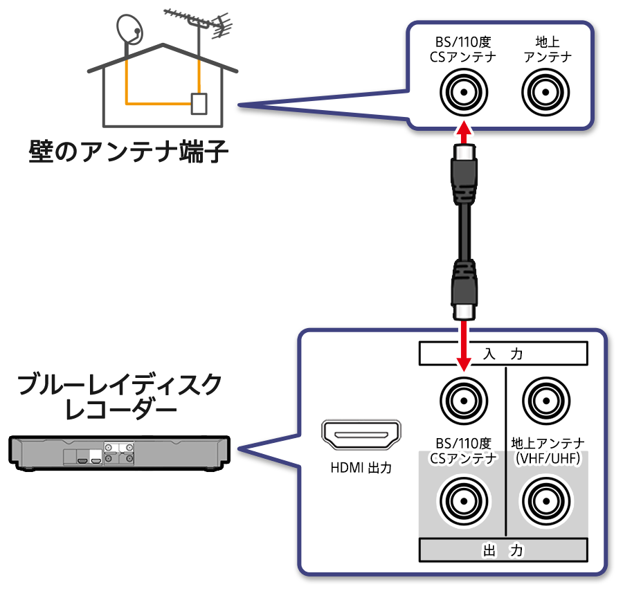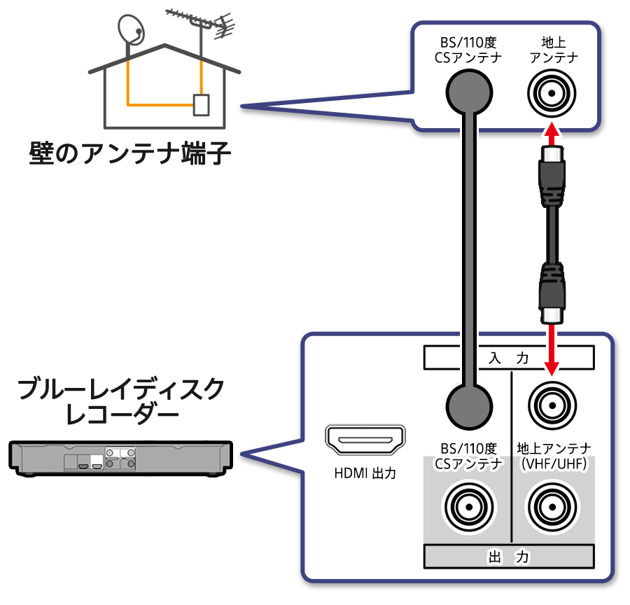 - 壁のアンテナ端子と、ブルーレイディスクレコーダーの「地上アンテナ(VHF/UHF)」入力端子を、地上アンテナケーブル(別売または本機付属)でつなぎます。