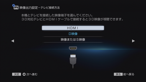 [HDMI]以外に設定されていたときは、[変更する]>[HDMI]>[自動]を選び、《決定》ボタンを押して設定してください。