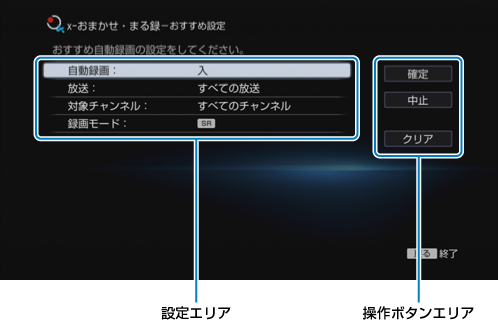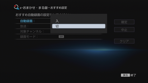 x-おまかせ・まる録のおすすめ設定画面で[自動録画]>[切]を選び、《決定》ボタンを押します。
