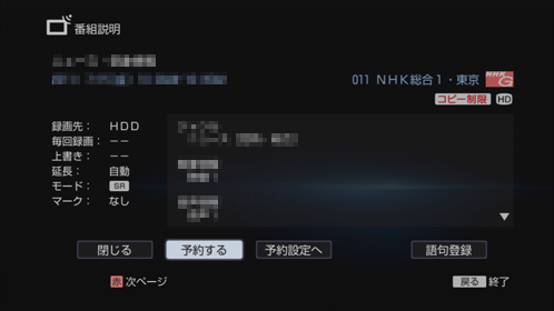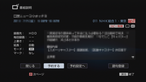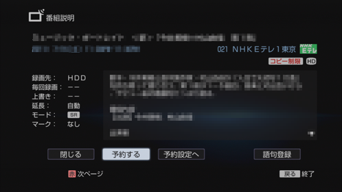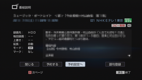 | 上書き([録画先]を[HDD]に設定した場合のみ) | [日付]で定期的に録画する設定にした場合に、前回録画した番組(タイトル)を削除した上で新しい回を録画します。前回録画した番組を消去したくない場合は、[上書き]の項目を[しない]に設定します。 |