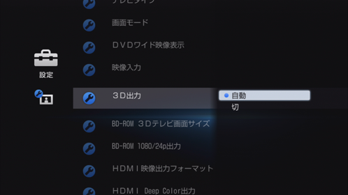 放送局側で3D信号が付けられた番組(タイトル)は、再生時に自動的に3D表示に切り換わり、画面上に3Dアイコンが表示されます。
