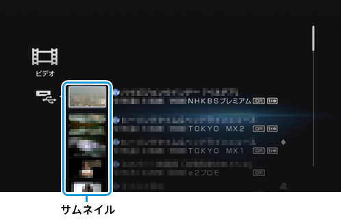 [ビデオ]> 再生したいサムネイル(タイトル)を選び、《決定》ボタンを押す。
