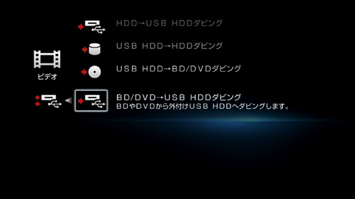 [USB HDDダビング]>[BD/DVD→USB HDDダビング]を選び、《決定》ボタンを押す。