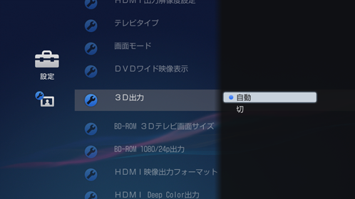 ホームメニューの左端にある[設定]>[映像設定]>[3D出力]>[自動]を選び、《決定》ボタンを押す。