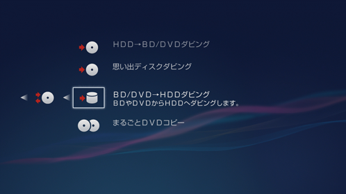 [ディスクダビング]>[BD/DVD→HDDダビング]を選び、《決定》ボタンを押す。