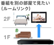 「ホームネットワーク(LAN)」でつなげば、ブルーレイディスクレコーダーで録画した番組や放送中の番組を家の中の好きなところで見ることができます。