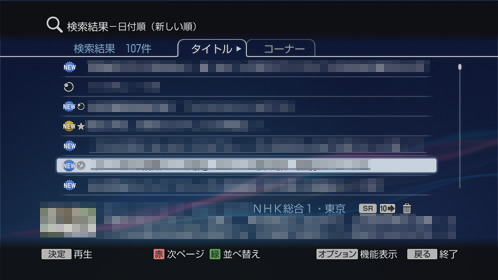 再生中に《戻る》ボタンを押します。他のタイトルやコーナーの再生ができます。ただし、再生中に《録画リスト》ボタンや《ホーム》ボタンを押すと、検索結果に戻れないことがあります。