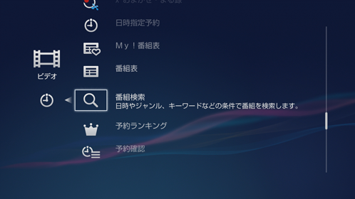 リストの上にある[録画予約]>[番組検索]を選び、《決定》ボタンを押す。