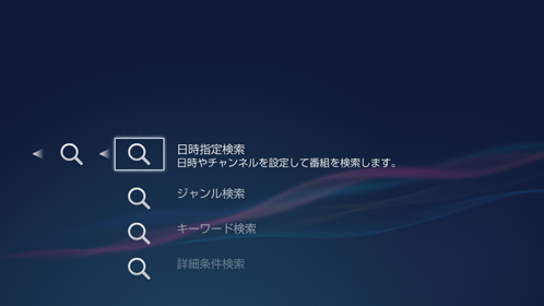 リストの上にある[録画予約]>[番組検索]>[日時指定検索]を選び、《決定》ボタンを押す。