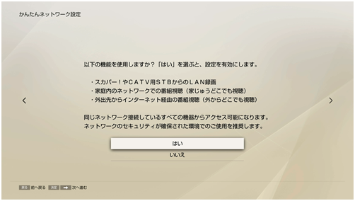 次の「インターネット機能を使用するための設定」で[はい]を選ぶと、「ネットワーク機能でできること」の「ホームサーバー機能を[はい][いいえ]どちらに設定しても使える機能」のみ使えるようになります。