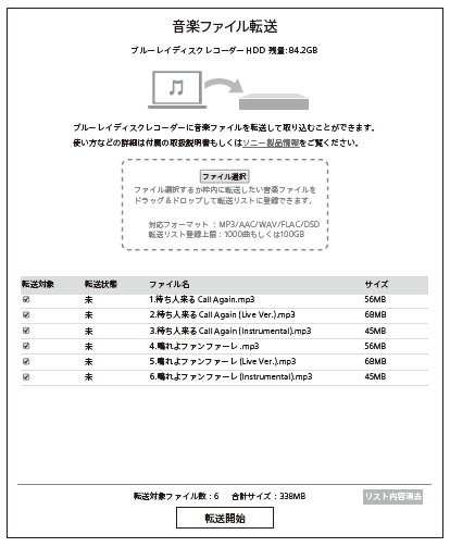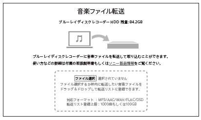 • ネットワーク状態が変わったときに、手順3の画面に表示される文字が変わることがあります。接続できなくなった場合は、ホームメニュー>[ダビング]>[音楽取り込み]を選び、表示される文字が変わっていないか確認してください。