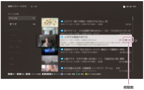 - 本機前面のUSB端子につないだSeeQVault対応外付けハードディスク内のタイトルは視聴数を表示できません。