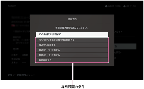 • [毎週(月-金)録画する]などの毎回録画の条件を選ぶと