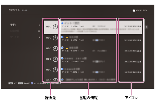 • 毎回録画の条件を設定している場合、予約リストには直近の1件しか表示されませんが、番組表で実際の予約状況が確認できます。