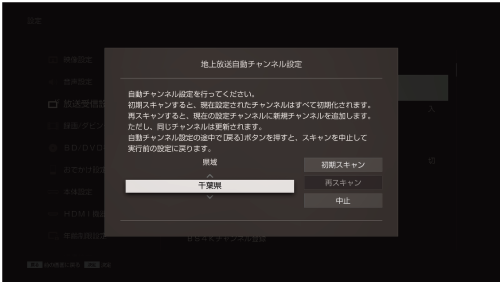 本機の電源を入れ、ホームメニュー>[設定/お知らせ]>[詳細設定]>[放送受信設定]>[地上放送自動チャンネル設定]で、お住まいの県域に合わせて初期スキャンを行ってください。