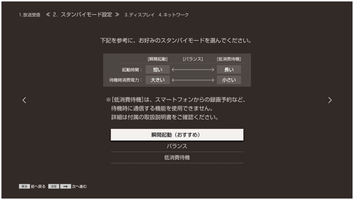 [瞬間起動(おすすめ)]を選ぶと、消費電力は増えますが、電源を入れてからすぐに操作できます。