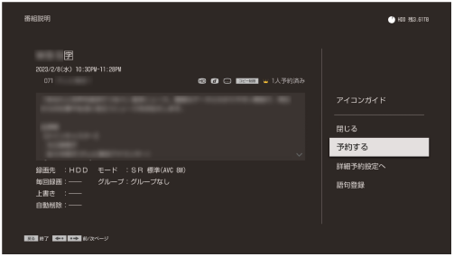 予約した番組を選び右矢印を押して、[予約修正]または、[予約削除]を選びます。