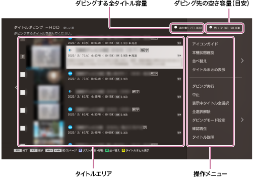 - ディスクに入りきらない容量のタイトルを選んだ場合は、ダビングを開始できません。ダビングモードを変えるとダビングできる場合は、自動調整の画面が表示され、ダビングできます。