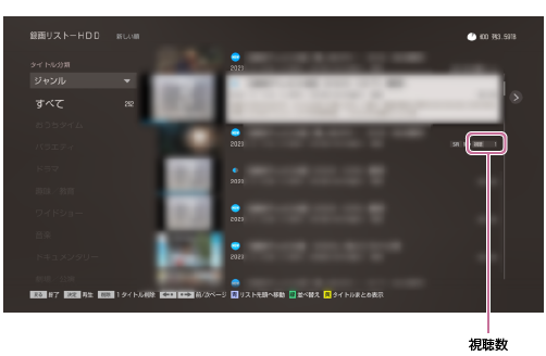 - 本機前面のUSB端子につないだSeeQVault対応外付けハードディスク内のタイトルは視聴数を表示できません。