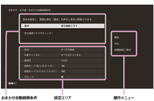 ジャンルやキーワードなどの条件を設定すると、番組表データの中から本機が自動でその条件に合った番組を探し、1日最大で20件(うちBS4K/110度CS4K放送番組は最大10件)まで録画します。