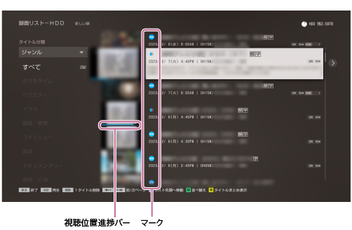 タイトル一覧のタイトルの横に表示されるマークで現在の視聴状態がわかります。また、サムネイルの下に表示される視聴位置進捗バーでどこまで視聴したかを確認できます。