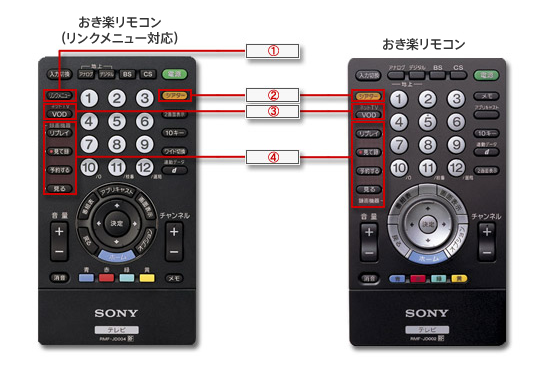 | ① | リンクメニューブラビアリンク (リンクメニュー対応) のみ | リンクメニューボタンより接続した機器を選択し、ブラビアの画面を見ながら対応機器の操作メニューなどを表示します。 たとえば、リンクメニュー対応の“ハンディカム”なら、再生インデックス選択画面を表示できます。撮影した映像の再生、早送りなどの操作ができます。 |